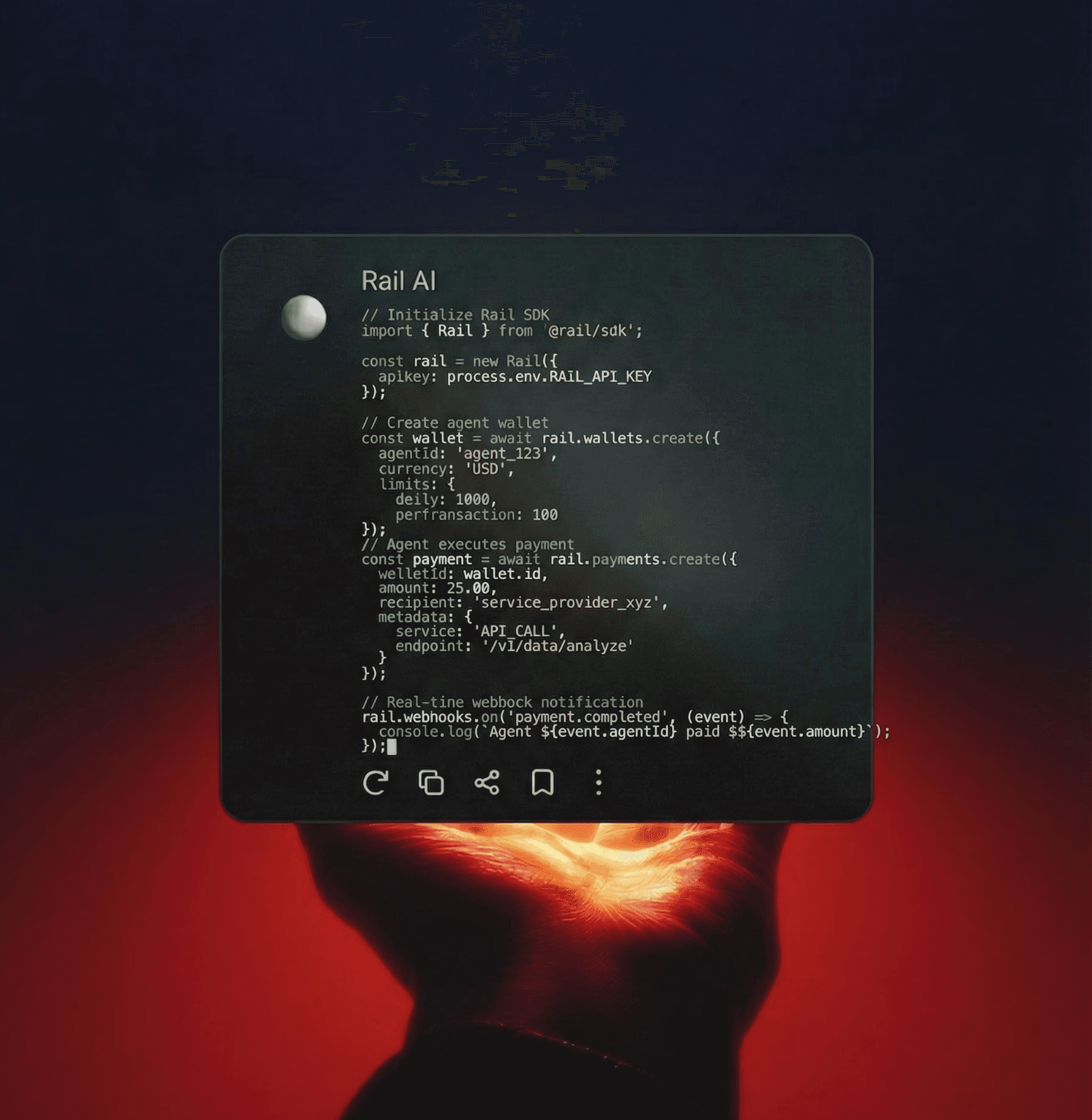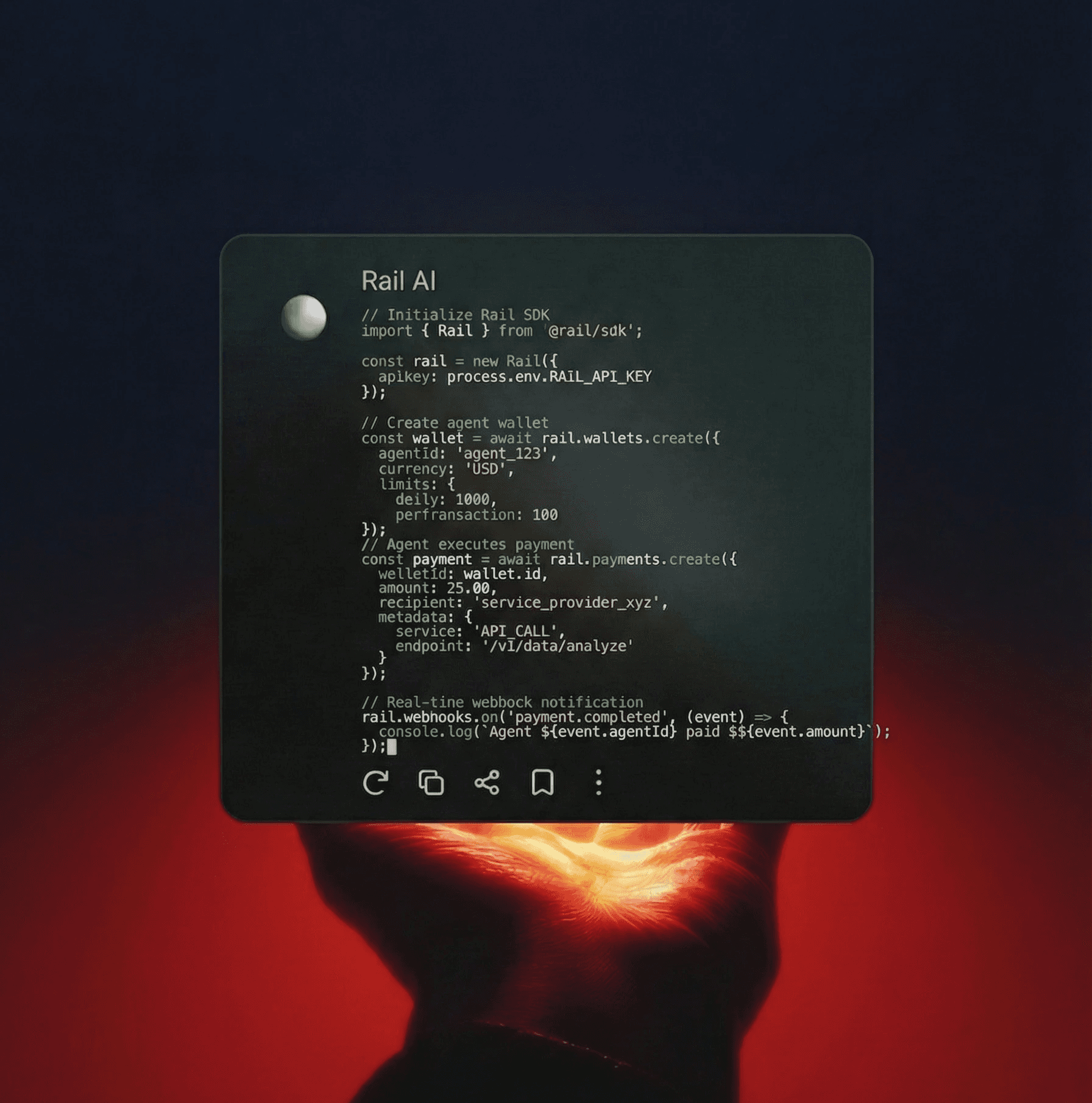Integrate Rail's API in minutes. Give your AI agents secure access to payment rails with just a few lines of code.